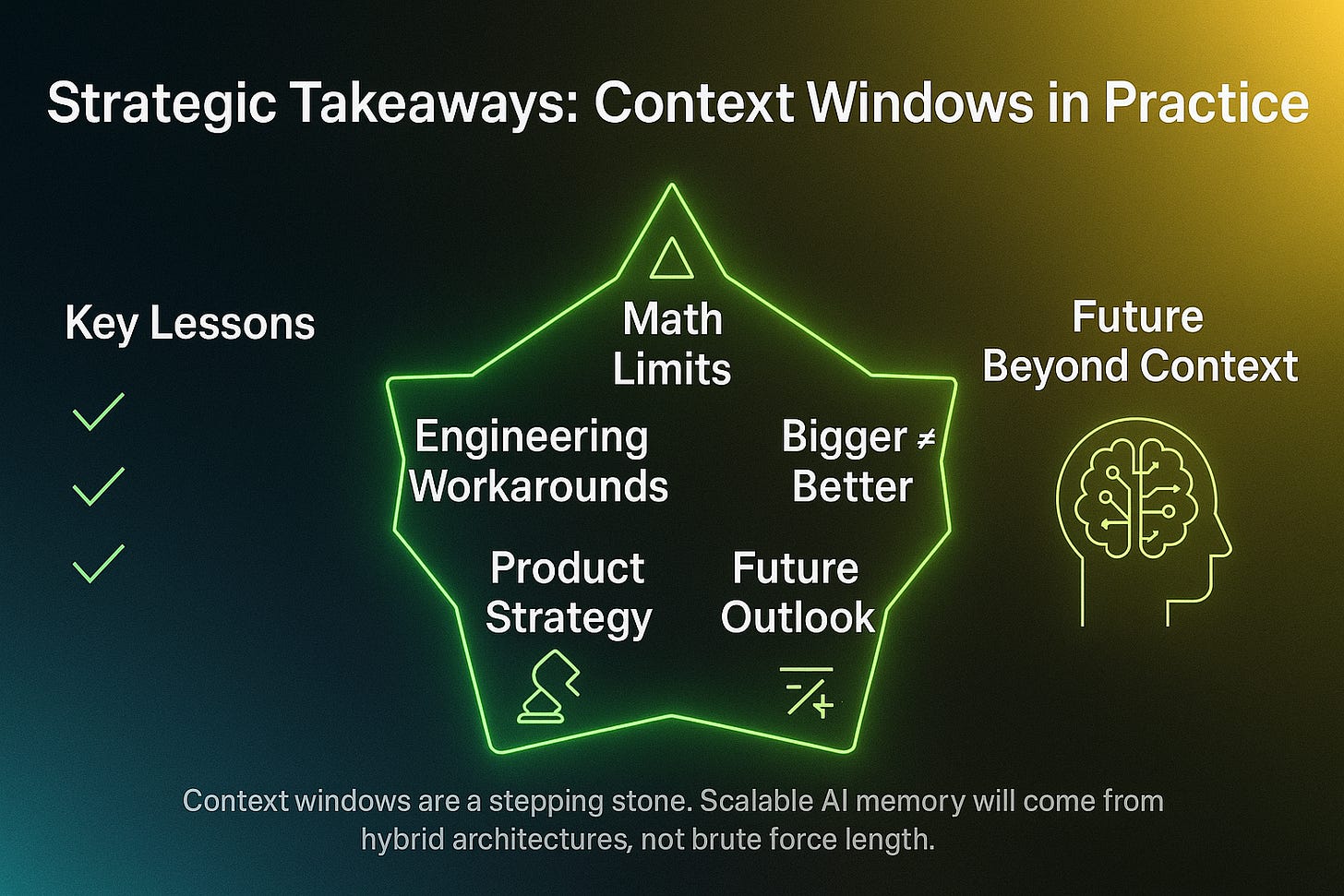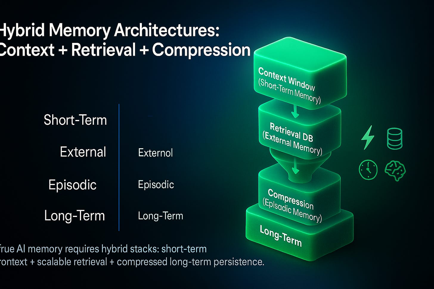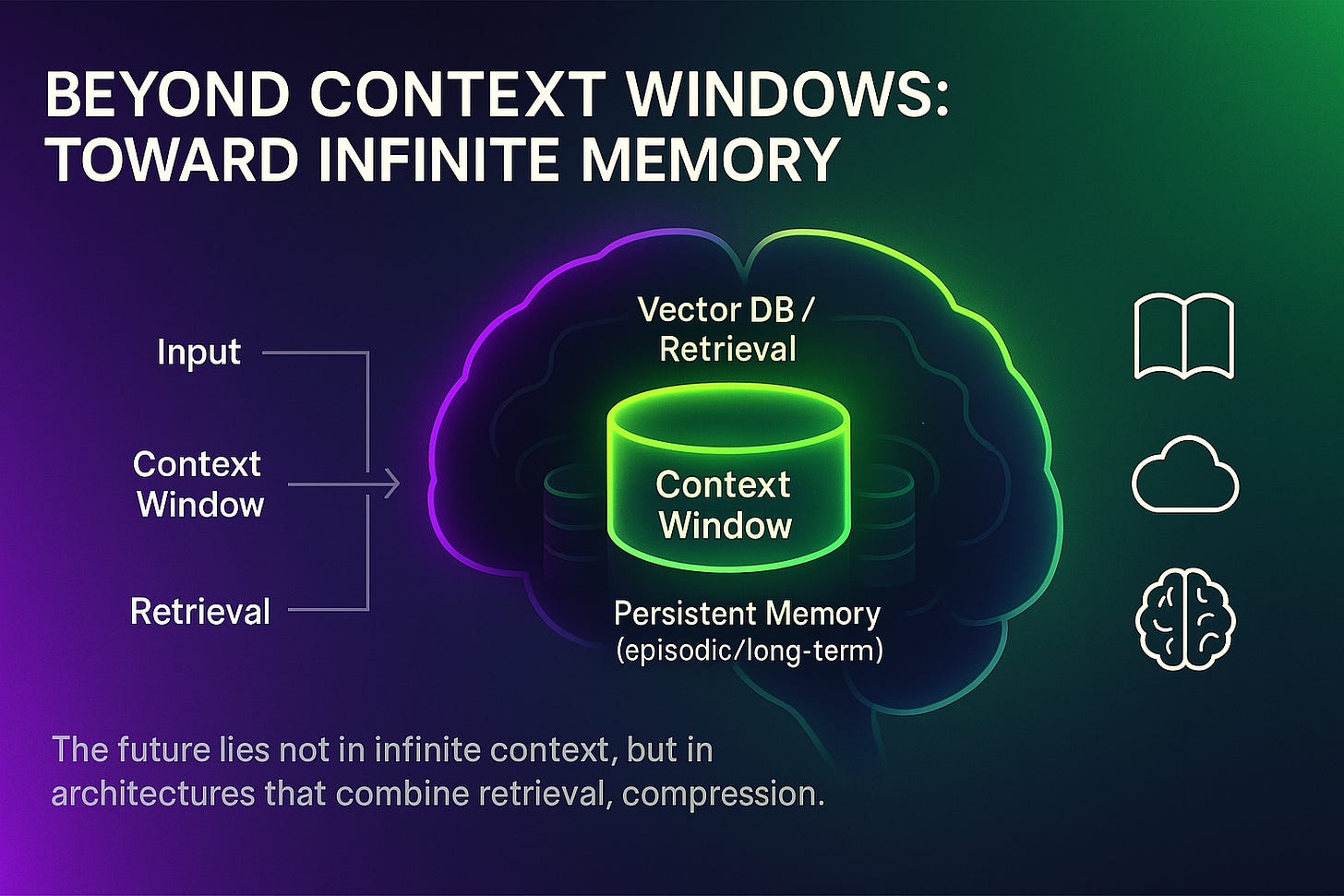 The race for ever-larger context windows will continue—but it’s not where the real breakthrough lies. The next frontier is hybrid AI memory: architectures that blend short-term context, retrieval databases, episodic compression, and long-term persistence.
