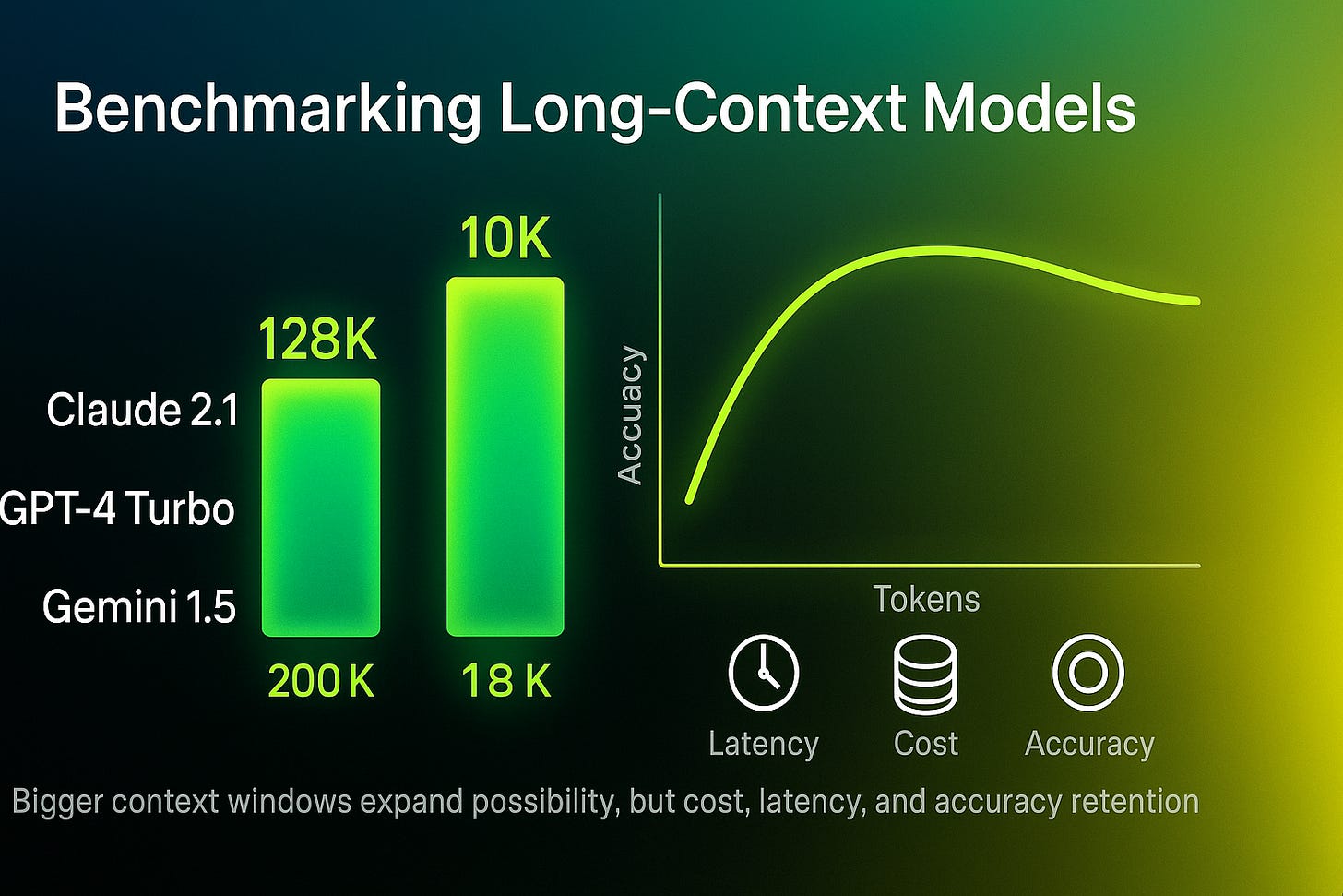 Accuracy does not scale linearly. Beyond ~64K tokens, models often lose precision unless combined with RAG.
